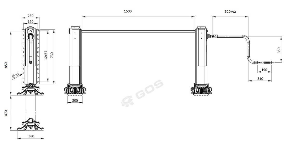 Опорное устройство GOS 850mm, S-опора, комплект, вал и ручка Опорное устройство GOS 850mm, S-опора, комплект, вал и ручка GOS на заказ